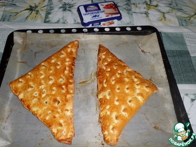 Накрываем начинку свободным краем теста, придавая пирожку форму треугольника. Защипываем края. Аналогично делаем остальные 3 пирожка.