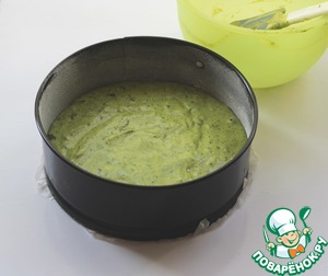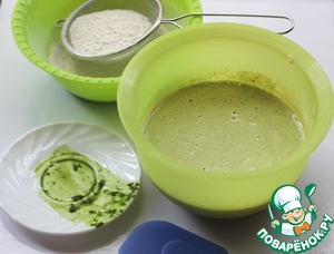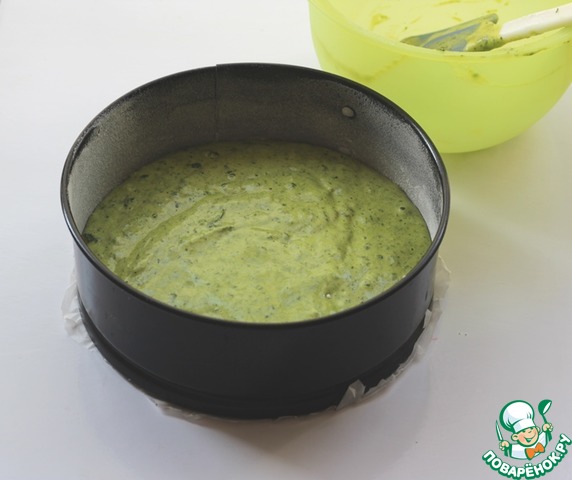 Шпинатную массу соединить с яичной и добавить просеянную муку с разрыхлителем.