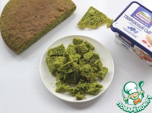 Готовый бисквит остудить, нарезать на небольшие кусочки или наломать. У меня половина бисквита ушло на трайфл, из второй половины я приготовила пирожное.