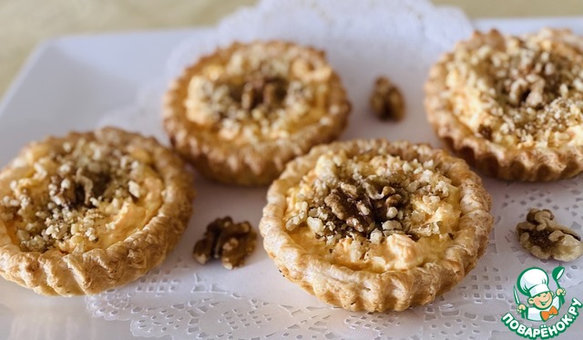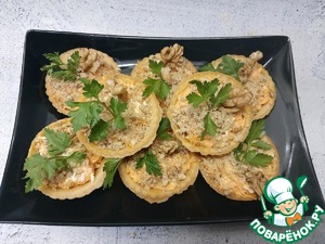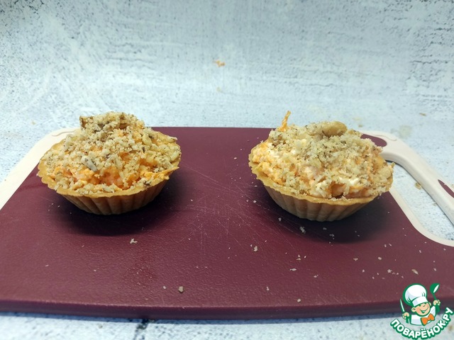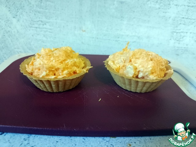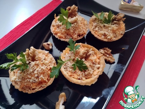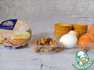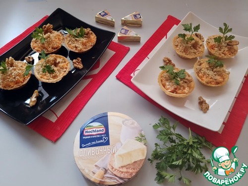 В салате гармонично сочетается плавленый сыр "Сливочный" Hochland, морковь и яйцо. Грецкие орехи придают сытность салату. Подача в тарталетках украсит стол для "Званого обеда".