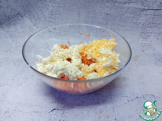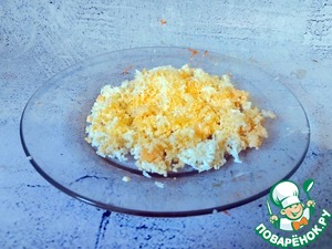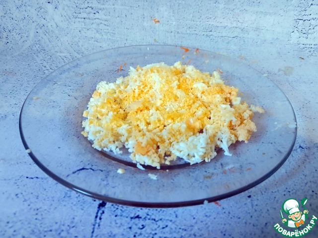 Яйцо отварить вкрутую, очистить, остудить. Натереть на мелкой терке.