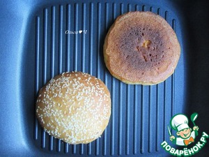 • Булочку разрежьте вдоль пополам, подсушите на сухой сковороде-гриль.
