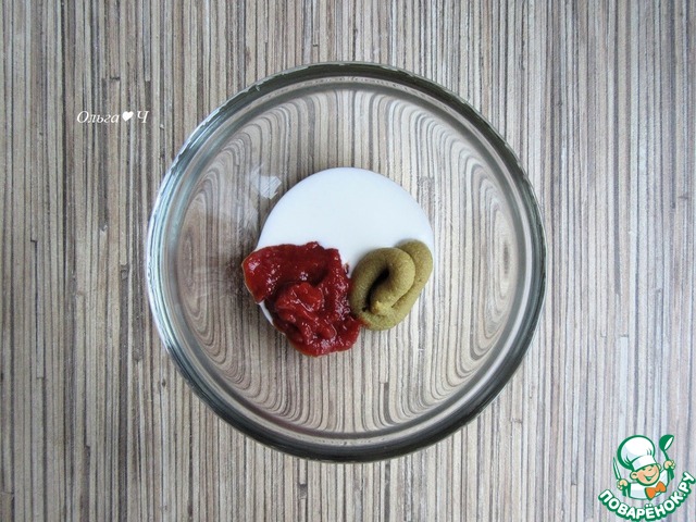 • Для соуса смешайте йогурт, томатную пасту и горчицу.