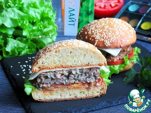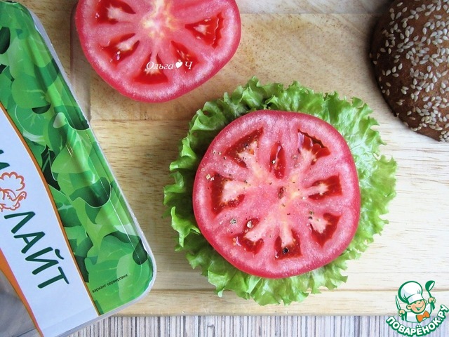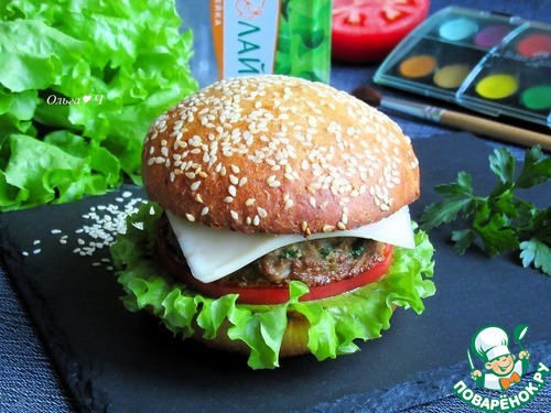 Чизбургер с рубленной котлетой из филе голени индейки, ломтиком помидора, плавленым сыром и острым соусом в домашней булочке с кунжутом. Очень сытный перекус для старшеклассников, студентов или работающих, который можно взять с собой. Попробуйте!