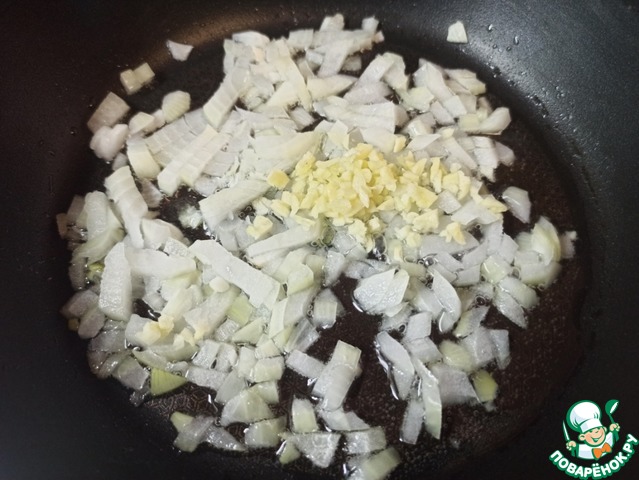 Обжарить до мягкости лук и чеснок. У меня маленькая луковица, если крупная, то используйте половину.