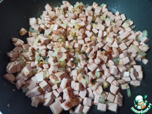 Варёную колбасу нарезать маленькими кубиками и добавить к луку. Обжарить всё вместе еще пару минут.