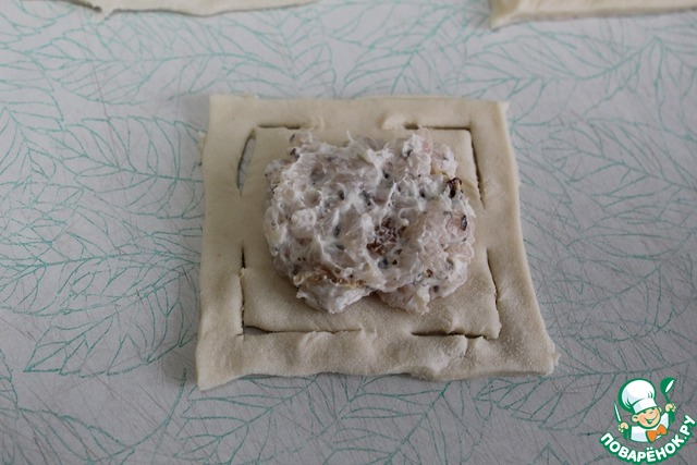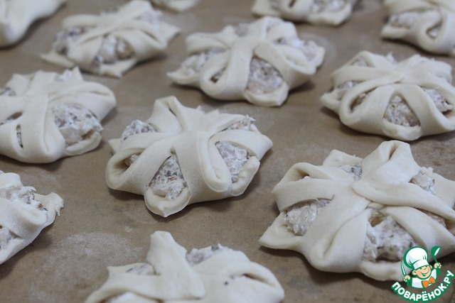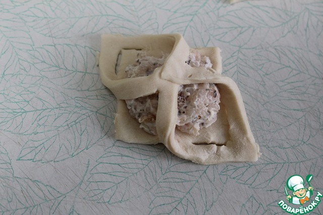 Быстрые пирожки из слоеного теста с начинкой из куриного филе, творожного сыра ТМ Hochland, с базиликом и сушеными томатами прекрасно подходят в качестве перекуса с собой на пикник. Пробуем?