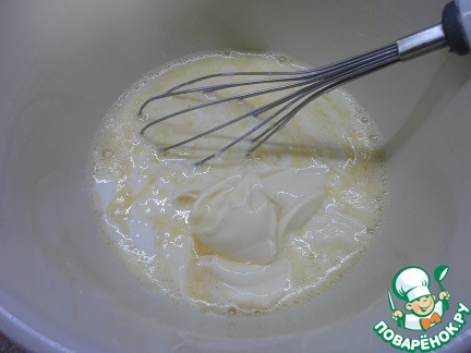 Для теста яйца взбить с солью. Добавить кефир. Добавить плавленый сыр и все хорошо перемешать.