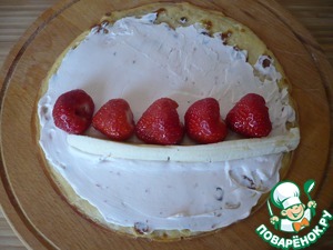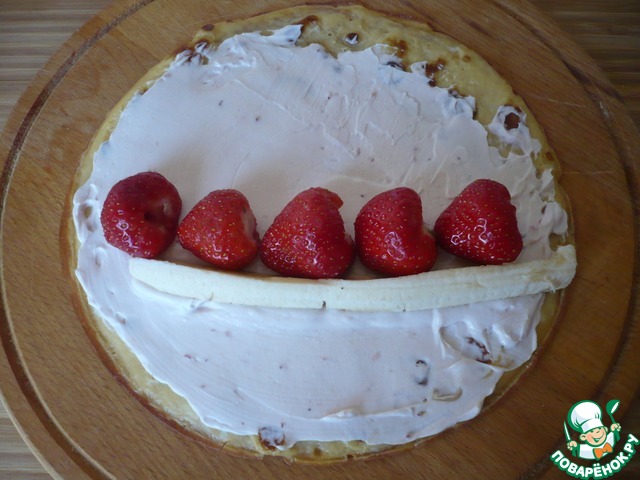 Далее – формируем роллы. Промазываем каждый блин толстым слоем приготовленного крема и сверху выкладываем разрезанный банан и клубнику.