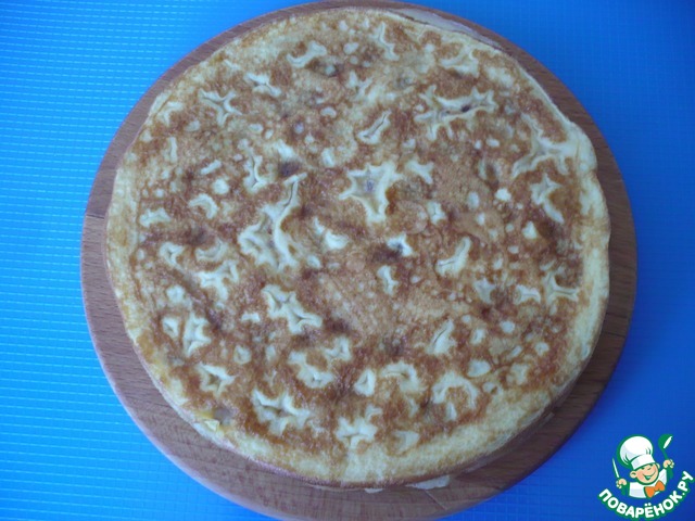 Затем хорошо прогреваем сковороду (у меня d - 24 см), смазываем её тонким слоем растительного масла и выпекаем самый обычный, довольно плотный блинчик. Из этого количества теста получается 5 штук яичных блинов.