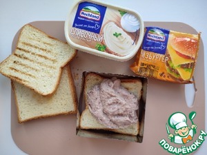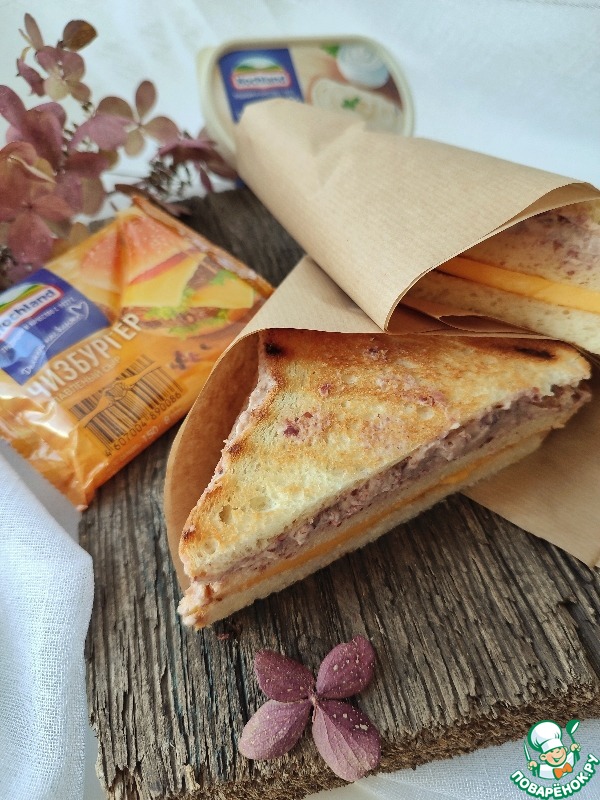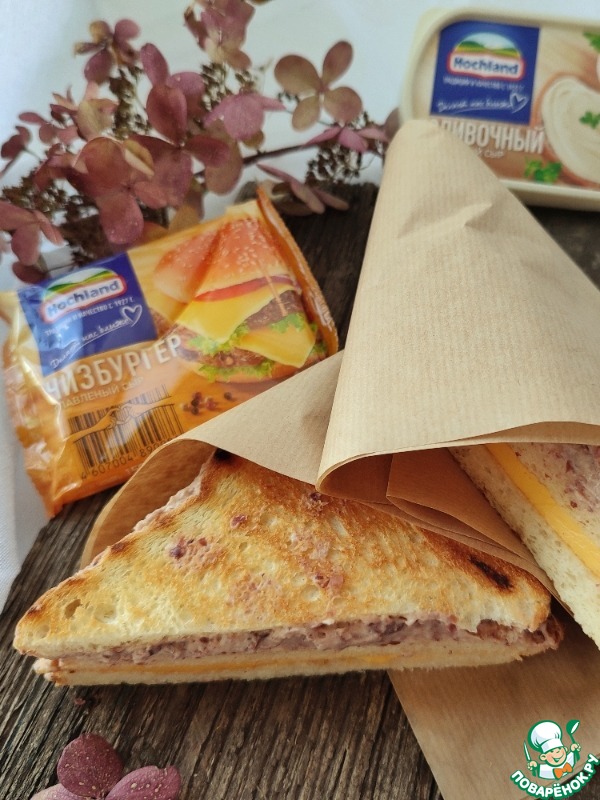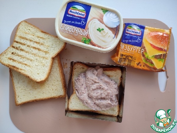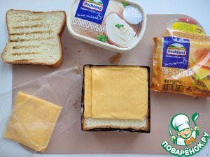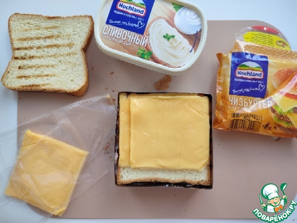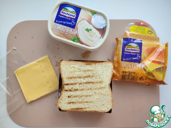 - Сыр плавленый (ТМ "Hochland": сливочный + чизбургер на второй слой) — 100 г