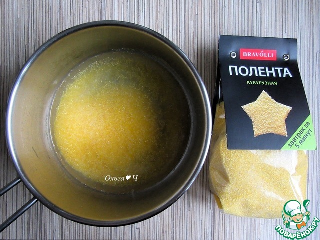 Поленту засыпьте в холодную воду, доведите до кипения, постоянно помешивая венчиком.