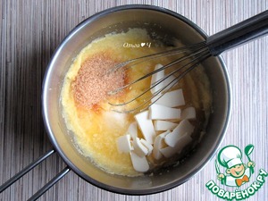 Добавьте кокосовую стружку* и яйцо (убедитесь, что масса достаточно остыла, чтобы белок не свернулся). Перемешайте. *Если у вас нет желтой кокосовой стружки, то добавьте к обычной 1/4 ч. л. куркумы.
