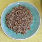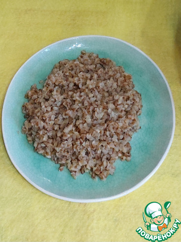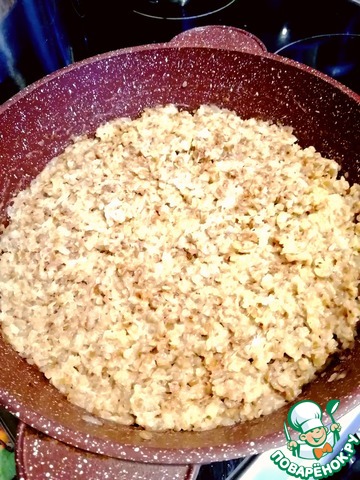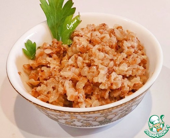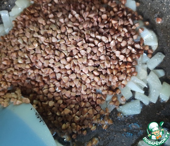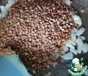 Добавить к луку гречневую крупу и слегка погреться, буквально минутку помешивая.