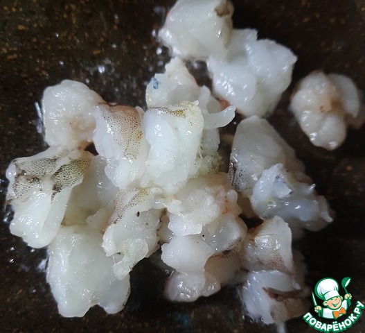 На растительном масле припустить чеснок, добавить креветки поджаривать около минуты. Посолить -