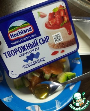 Смешать манго, авокадо, перец чили (молотый), мед. Добавить творожный сыр ТМ Hochland. Перемешать.