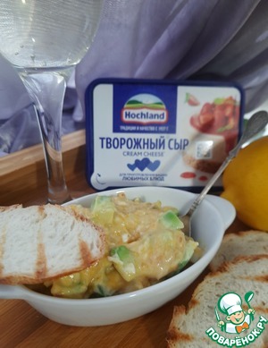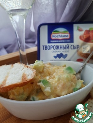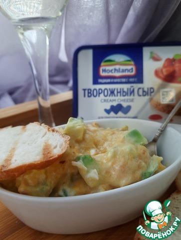 Такая закуска прекрасно сочетается с игристым или молодым вином. Можно подавать её сразу на тостах, а можно выложить в красивую креманку и разложить рядом поджаренный хлеб.. Добавление творожного сыра ТМ Hochland смягчает остроту перца чили и гормонизирует вкус блюда