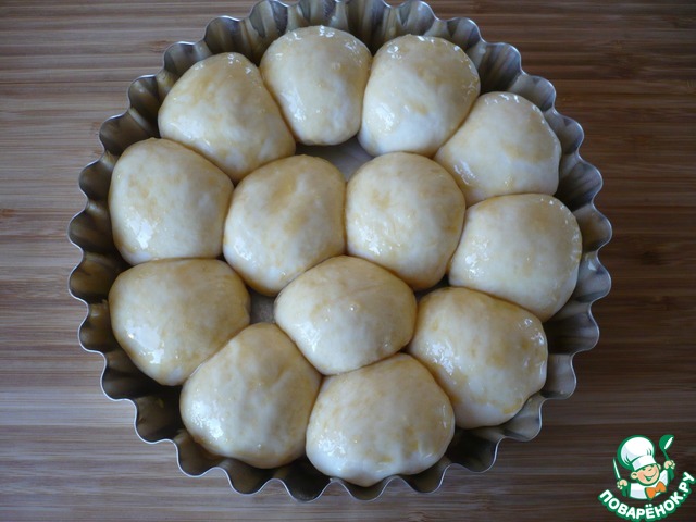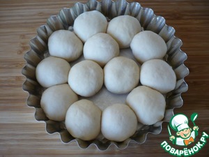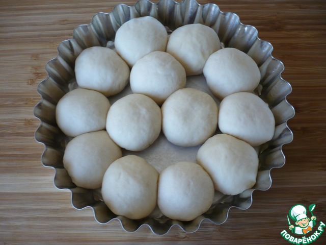 Разделите тесто на 13 колобков ~ по 45 граммов каждый. Форму для выпечки (d- 20 см) застелите пергаментной бумагой и выложите приготовленные булочки, накройте пищевой пленкой и поставьте в теплое место для подъема.