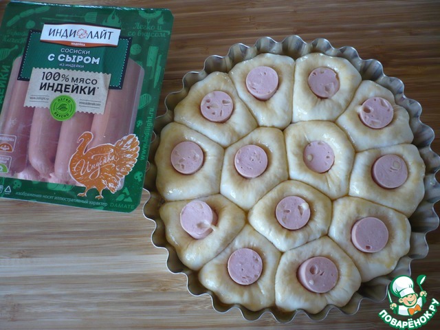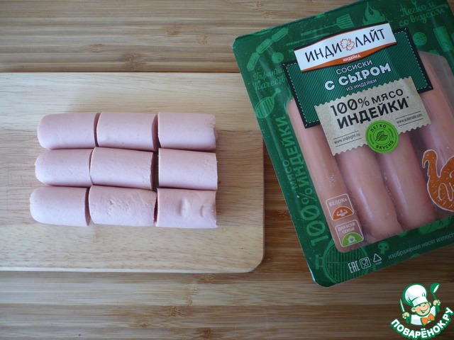 Для начинки булочек я использовала сосиски с сыром из индейки ТМ "Индилайт", каждую сосиску разрежьте на три одинаковые части.