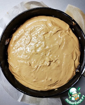 Выпекать корж в течение 15 минут при 180 градусах. Остудить в форме. Борта формы смазать сливочным маслом. Понизить температуру в духовке до 100 градусов.