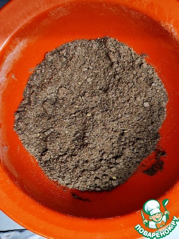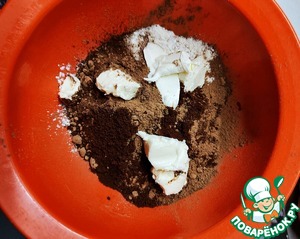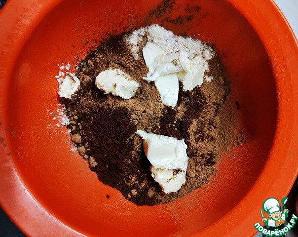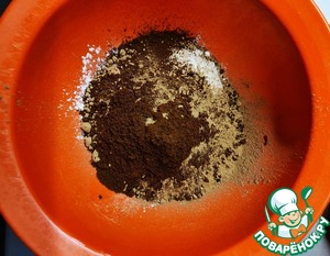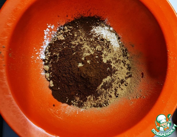 Смешать муку, сахар, сахарную пудру, кофе и какао
