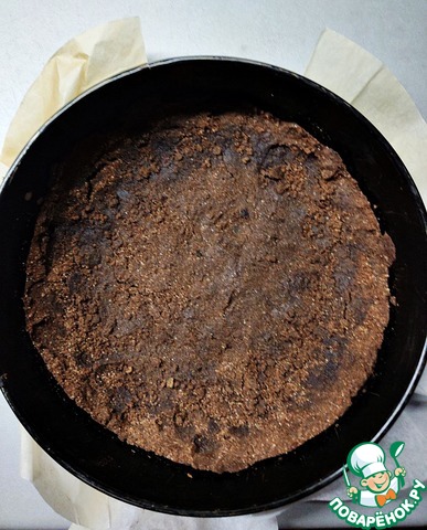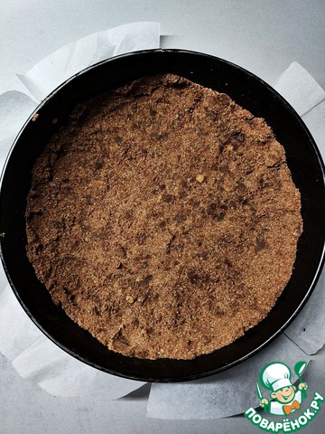 Форму диаметром 16 см застелить пергаментной бумагой. У меня такой формы нет. Я ж не кондитер :). Я взяла форму 24 см и увеличила количество ингредиентов в 1,5 раза. Только основу. Начинка осталась по норме. Чизкейк получился вполне нормальный по высоте. Распределить крошку по дну формы, утрамбовывая и формируя бортики примерно 1,5 см высотой. Край выравнивать не обязательно.
