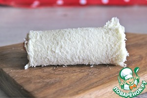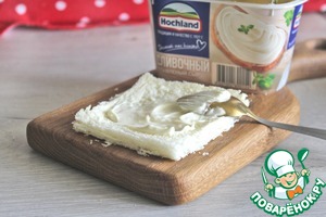 Раскатанный ломтик хлеба смазать с одной стороны равномерно плавленым сыром Сливочный ТМ Hochland.