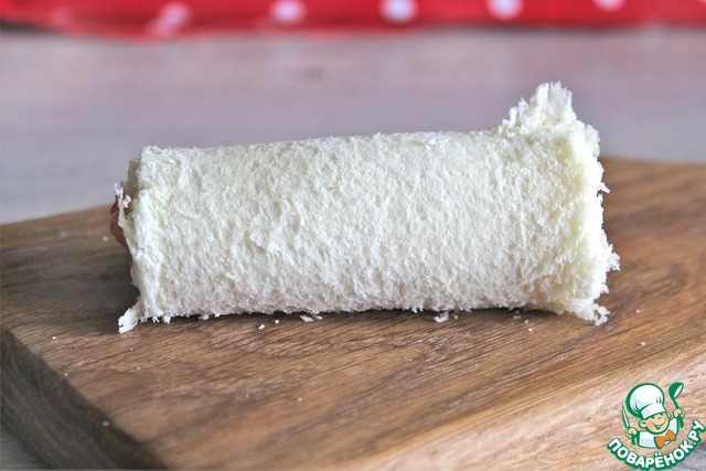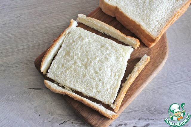 У ломтика тостового хлеба обрезать со всех сторон корочку.