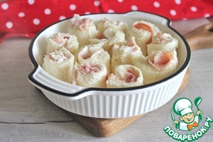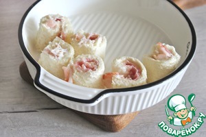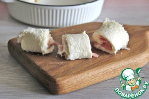 Выложить кусочки рулетика срезом вверх в форму для запекания.