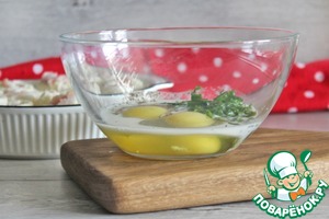 Приготовить омлетную массу. Для этого в чашку разбить яйца, влить молоко, посолить, поперчить по вкусу, добавить мелко нарезанные зеленый лук и зелень укропа, хорошо перемешать.
