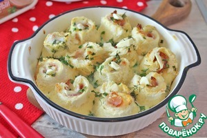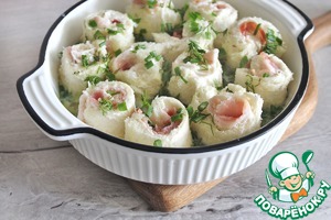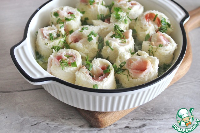 Получившейся омлетной массой залить хлебные рулетики, уложенные в форме для запекания, посыпать мелко порезанной зеленью укропа и зеленого лука.