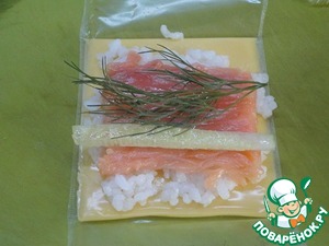 Ломтики плавленого сыра положить на стол и снять с одной стороны пленку. На сыр выложить рис, рыбу и сбрызнуть лимонным соком. Затем кусочек огурца и веточку укропа.