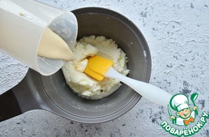Вливаю желтки в горячую поленту и интенсивно перемешиваю массу. -