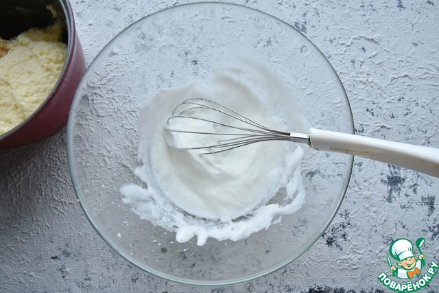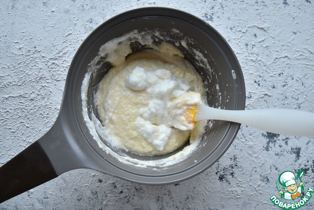 Порциями, добавляю взбитый белок в массу для пудинга и вмешиваю в смесь.