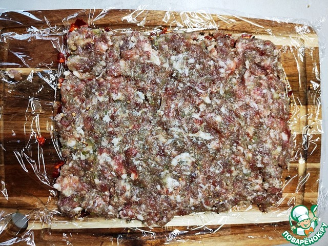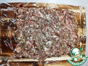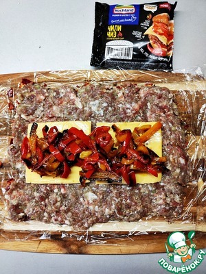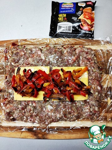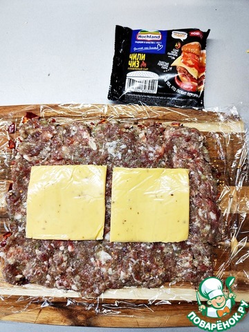 На фарш положить пластины плавленого сыра Чили чиз ТМ Hochland. Сыр поможет закрепить каркас рулета и придаст пикантную сливочную остринку.