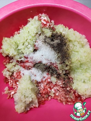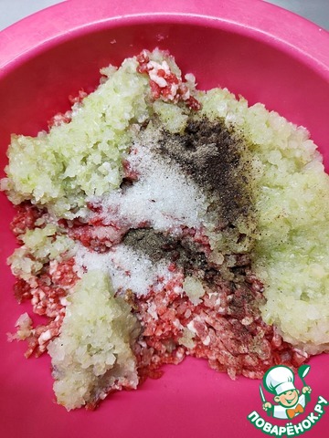 В мясной фарш добавить измельченный лук, перец, мускатный орех. Фарш выбить, как на котлеты.