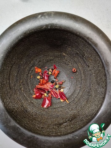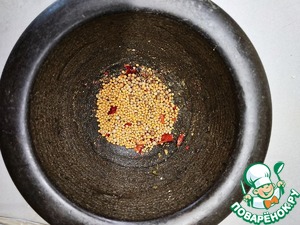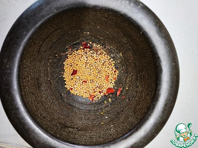 Добавить перец горошком, зерна горчицы, кориандр, немного потолочь.