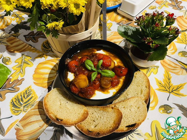Обжаренные помидорки черри в холодном сырно-йогуртовом соусе на хрустящем багете. Ну что сказать? Ну вы и сами догадались, насколько это вкусно! За основу взяла рецепт Шеф-повара из Питера Анны Рей.