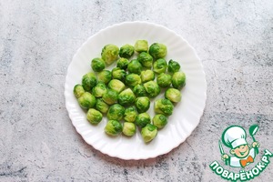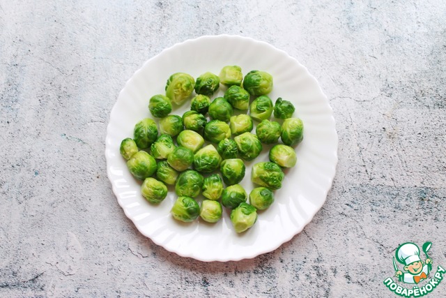 Качанчики отчистите от верхних листочков и срежьте жесткое основание. В кастрюле вскипятите воду, посолите и опустите брюссельскую капусту. Бланшируйте ее в течение 5 минут, откиньте на дуршлаг и сразу промойте холодной водой. Это поможет сохранить цвет.