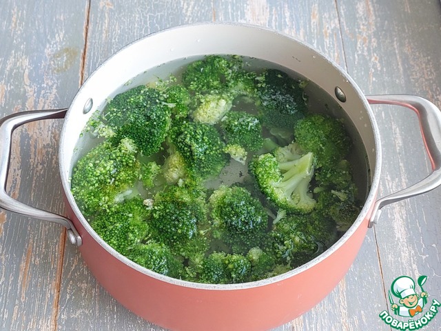 В кастрюльку поместить брокколи (у меня замороженная), налить воды, довести до кипения, варить 2 мин. Затем откинуть брокколи на дуршлаг.