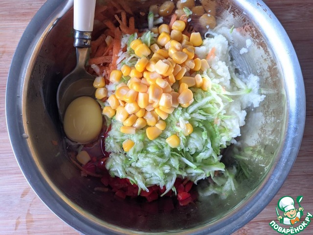 Цуккини отжимаем, лишняя жидкость не нужна, фарш и так жидковат, кладём в фарш. Добавляем яйцо, кукурузу (без жидкости), соль, перец. Тщательно вымешиваем фарш.