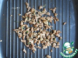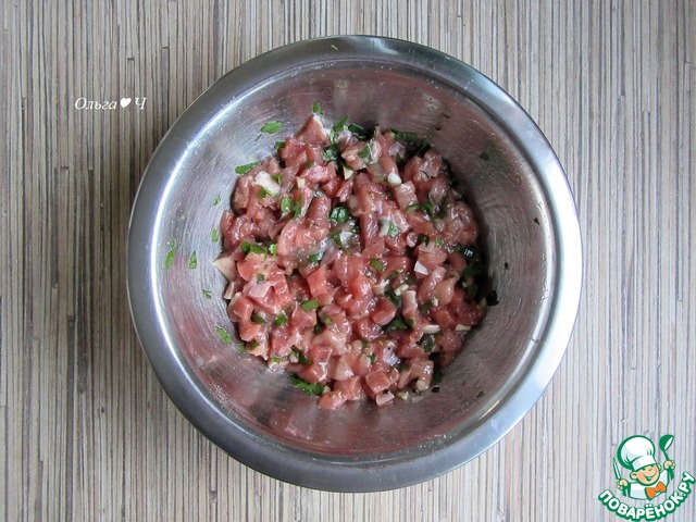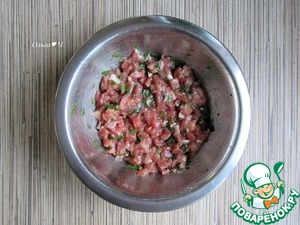 Филе мелко нарежьте, добавьте рубленную петрушку, соль, смесь перцев, измельченный чеснок, перемешайте.