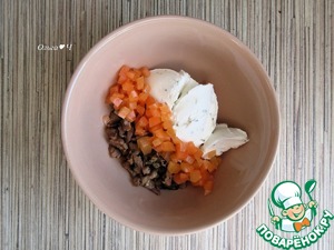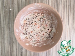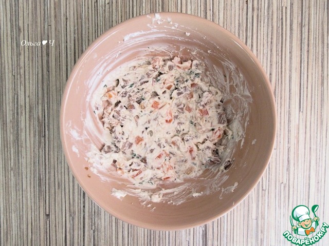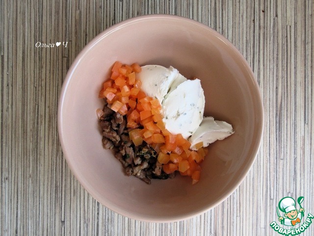 Соедините остывшую индейку с мелко нарезанным сладким перцем и творожным сыром.