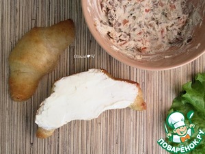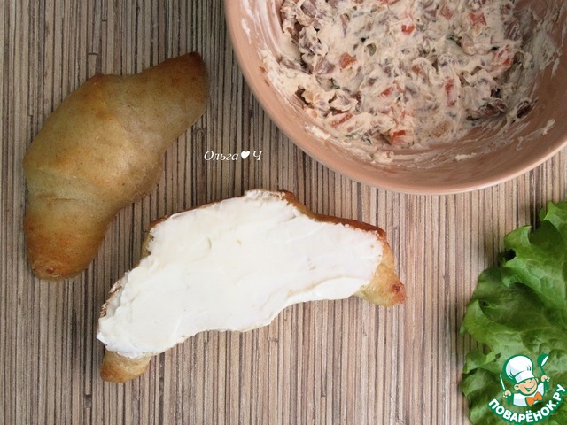 Круассаны разрежьте вдоль пополам, смажьте плавленым сыром обе части.