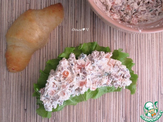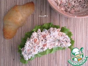 Выложите на нижние части круассанов листья салата, сверху - подготовленную массу с индейкой.