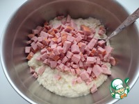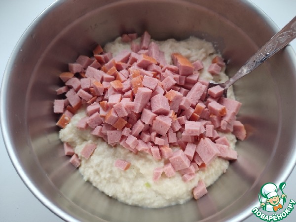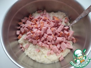 Колбасу нарезаем мелким кубиком и отправляем в наше "тесто". |