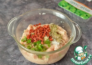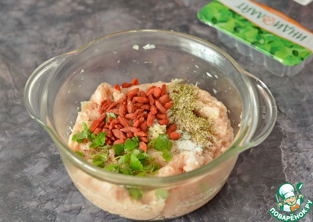 В миску положите фарш индейки, добавьте соль, сухие итальянские травы, натёртый на мелкой тёрке чеснок. С мелиссы оборвите листочки и добавьте их целиком, если они мелкие или порежьте, если крупные. Добавьте к фаршу сухие ягоды годжи.