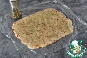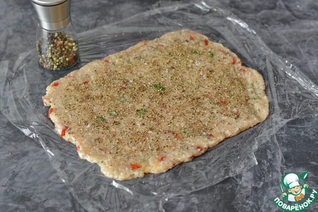 На рабочей поверхности расстелите плёнку. Выложите фарш слоем примерно 1 см, разровняйте его лопаткой или ложкой. И щедро по всей поверхности посыпьте чёрным молотым перцем из мельницы. Слой должен быть заметен.