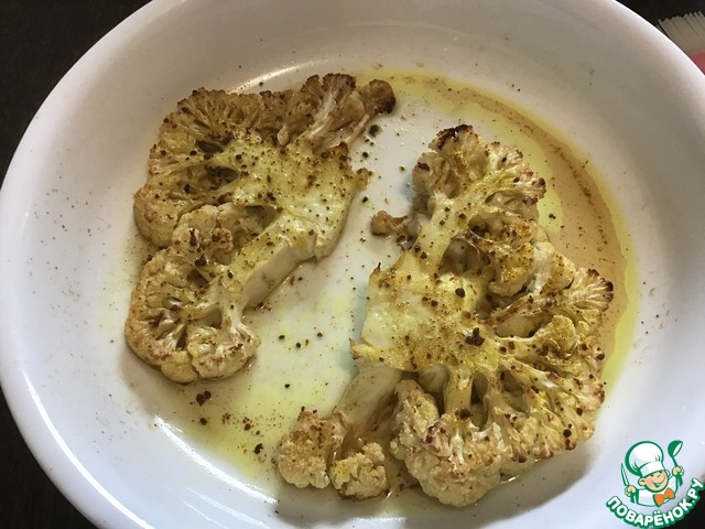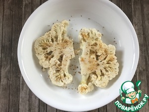 Очистите кочан цветной капусты от зеленых листьев и длинным острым ножом нарежьте на стейки 1,8 - 2 см толщиной, стараясь, чтобы стейки захватывали немного кочерыжки. Приправьте солью, черным молотым перцем и специями.