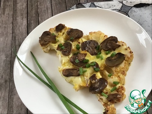 Есть желание приготовить оригинальный гарнир из несколько простых ингредиентов, затратив при этом минимум усилий? Тогда заходите и на вашем столе будет красоваться интересный и вкусный гарнир в виде «стейка» из цветной капусты c грибами. Уверена, что ваши родные и гости обязательно оценят оригинальность и вкус этого блюда.